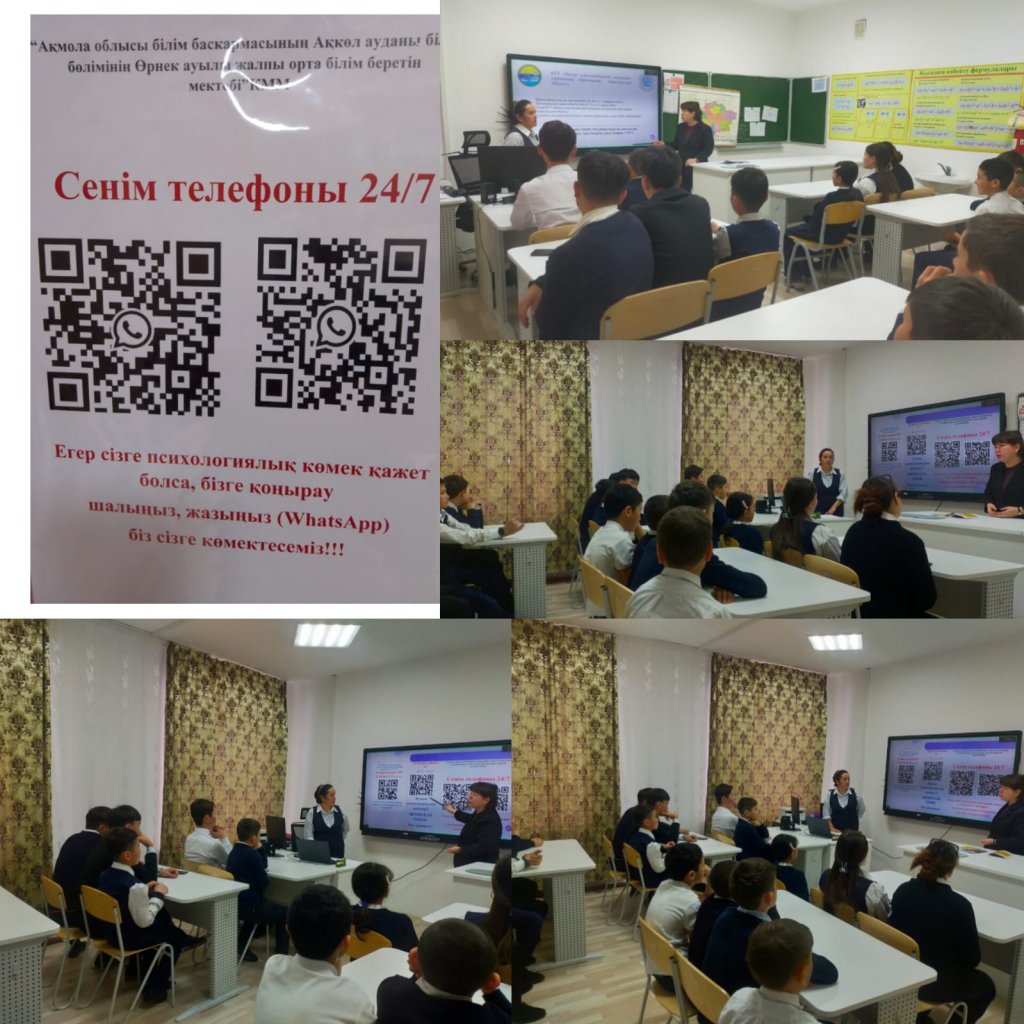 Директордың ТЖ жөніндегі орынбасары Б. А. Омирова мектептің педагог-психологы М.С. Бигатовамен бірлесіп психологиялық қолдау орталығының сенім телефонының жұмысы мәселесі бойынша білім алушыларға түсіндіру іс-шарасын өткізді. Іс-шараның мақсаты-оқушыларды сенім телефоны арқылы анонимді және білікті психологиялық көмек алу мүмкіндігі туралы хабардар ету. Әңгімелесу барысында оқушыларға қандай жағдайда қолдау сұрауға болатындығы, қандай сұрақтар қоюға болатындығы және сенім желісі қалай жұмыс істейтіні түсіндірілді