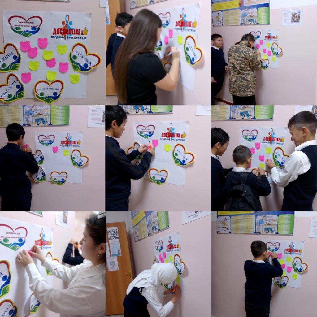 ДОСТЫҚ ҚОЛЫН ҰСЫН Бүгінгі күн — достық пен түсіністікті насихаттайтын «Дос болlike» » акциясы өтті . Бұл күннің мақсаты — балалар бір-біріне мейіріммен қарап, достықты нығайту, досқа адал болуға үйрену. Бір күлімсіреу — бір достықтың бастауы! Жақсылық жасау — достыққа деген адалдық «Дос болlike» акция барысында балалар достық туралы өз ойларын жазып . «Дос болlike»