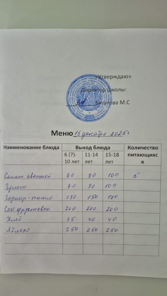 2025 жылғы 15 желтоқсандағы ас мәзір