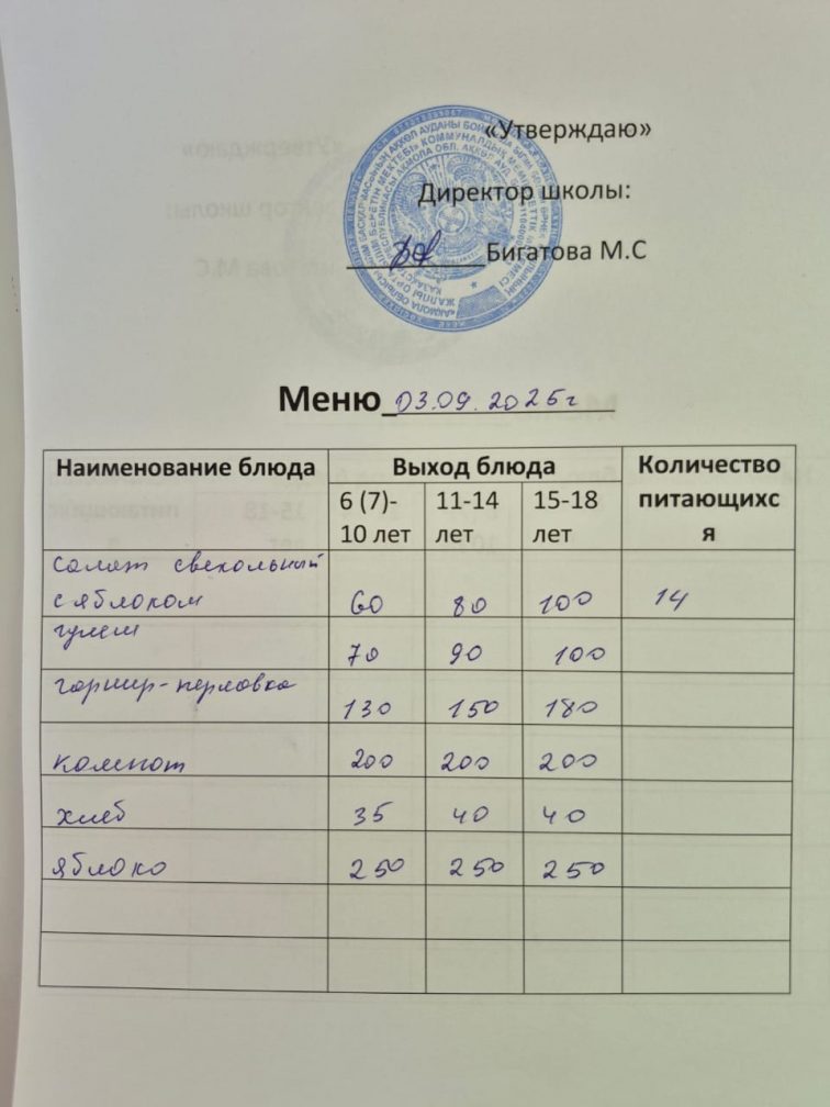 2025 жылғы 3 қыркүйектегі мәзір